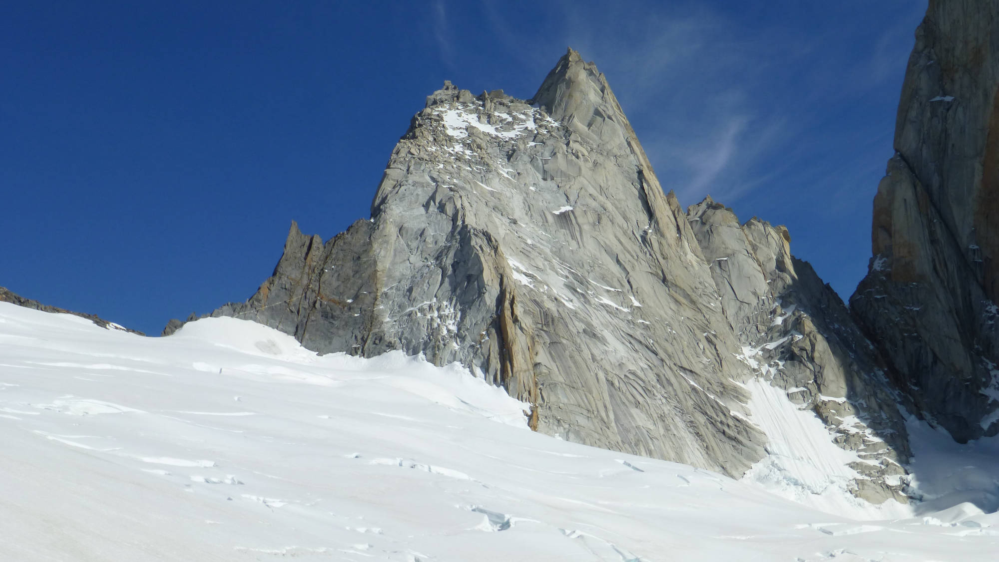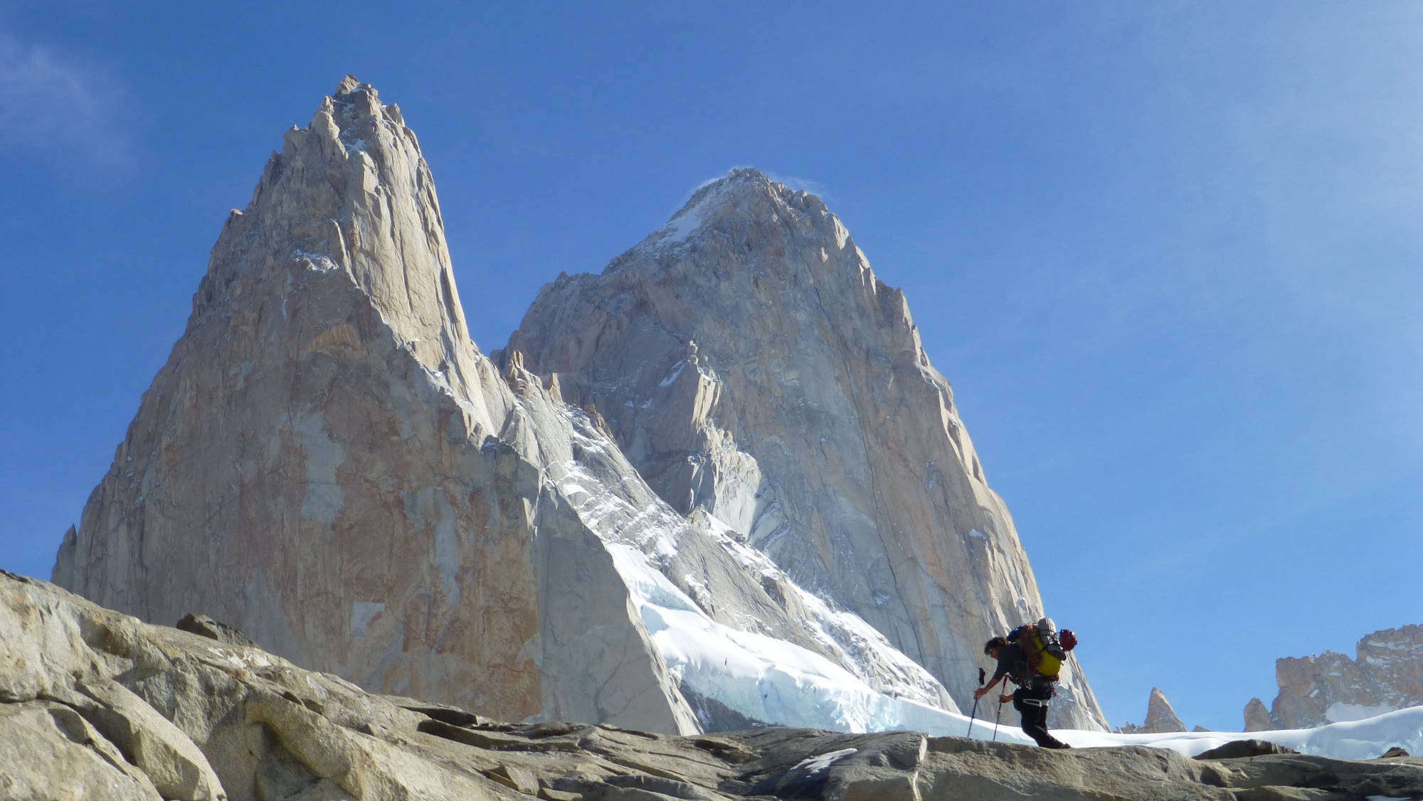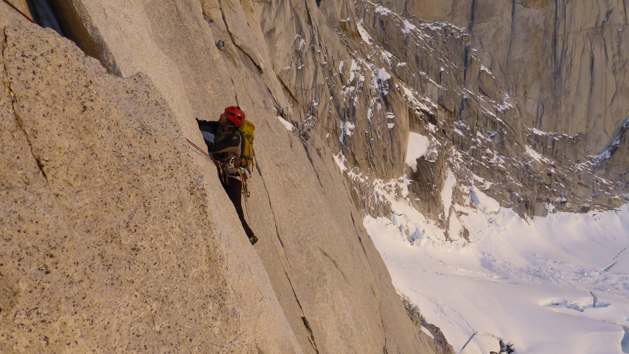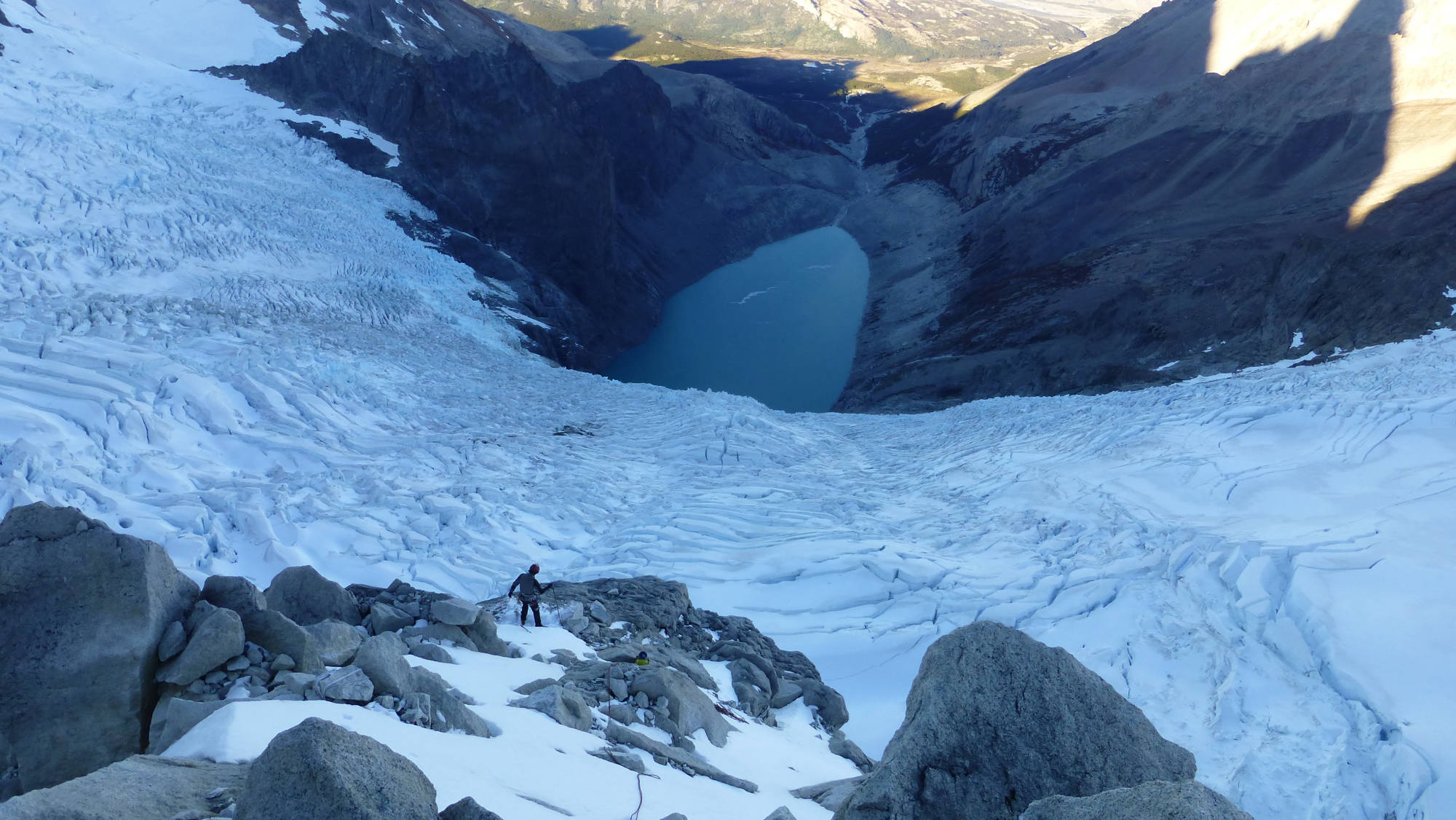 We´ll start before sunrise from our bivouac (4-5 am approx), after 45 min uphill through rocky terrain, we´ll reach the base of the glacier. From there we´ll continue with crampons and rope to the beginning of the climbing route. The climb starts with a snow couloir of 200m (50˚ slope), and then 7 rock climbing pitches of V+/6a (French scale) on very good granite! For the descent, we will rappel down to the start of the route and then walk down back to the bivouac site. The complete activity will take about 14 to 16 hours with a 1000 meters of elevation gain.