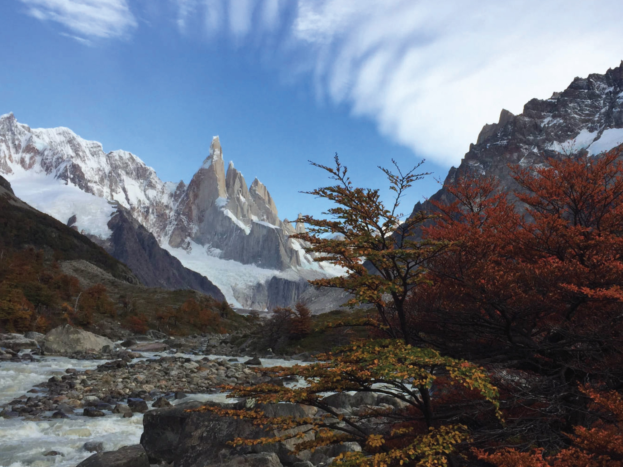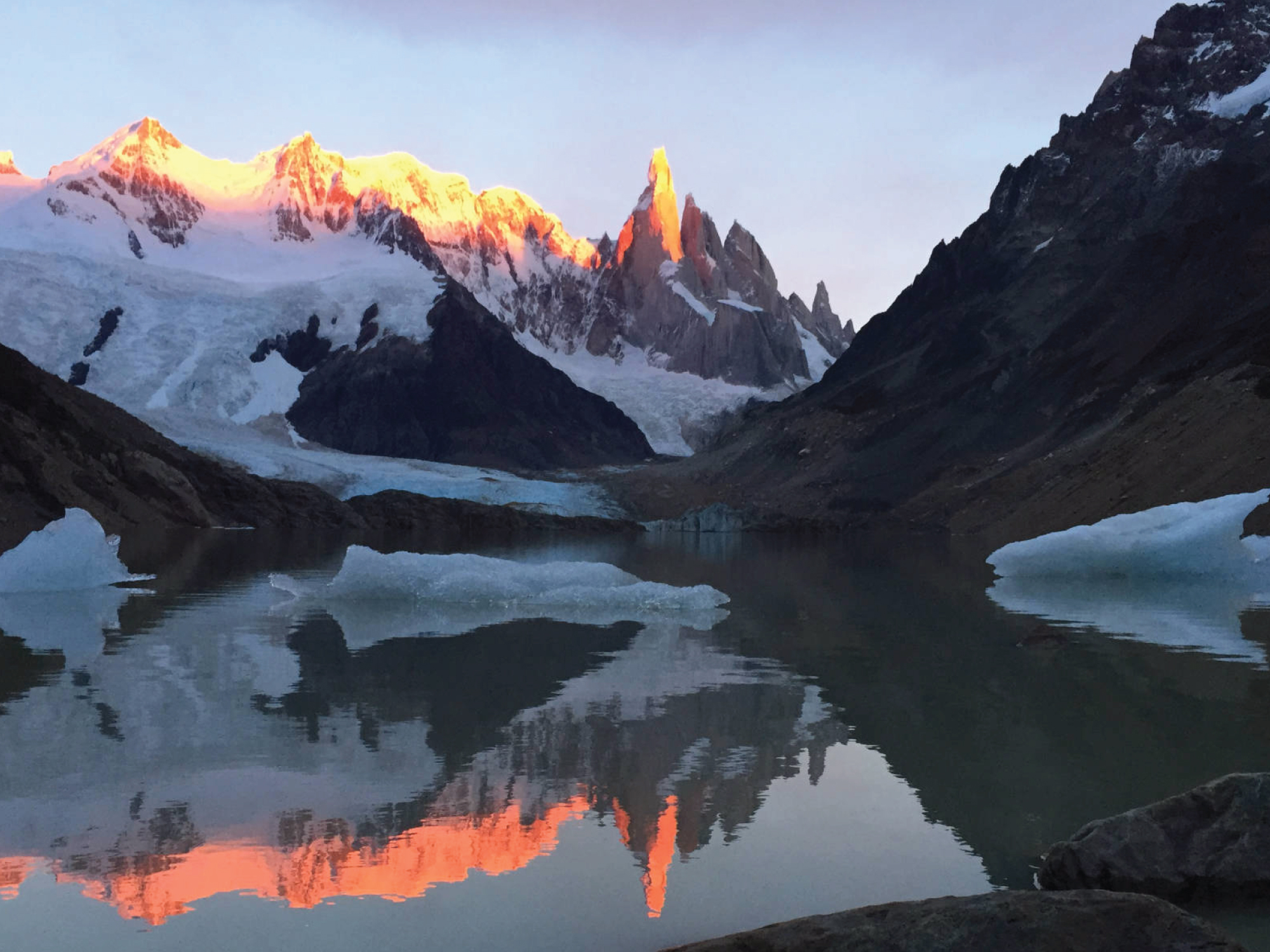 We will take the Laguna (lagoon) Torre trail from El Chaltén in the morning. After one hour hiking we will reach the first viewpoint to Cerro Torre and the Fitz Roy river valley. From here we’ll head down to the main valley of Fitz Roy river and walk another two hours to reach Laguna Torre, one of the most spectacular views of the mythical Cerro Torre. Also, first-row views to Cerro Solo, Techado Negro, Loma de las Pizarras and the nascent of the Fitz Roy river are well worth the walk. After a lunch break, we’ll return to El Chaltén by the same trail, arriving in town late in the afternoon. The activity will take about 7 hs.