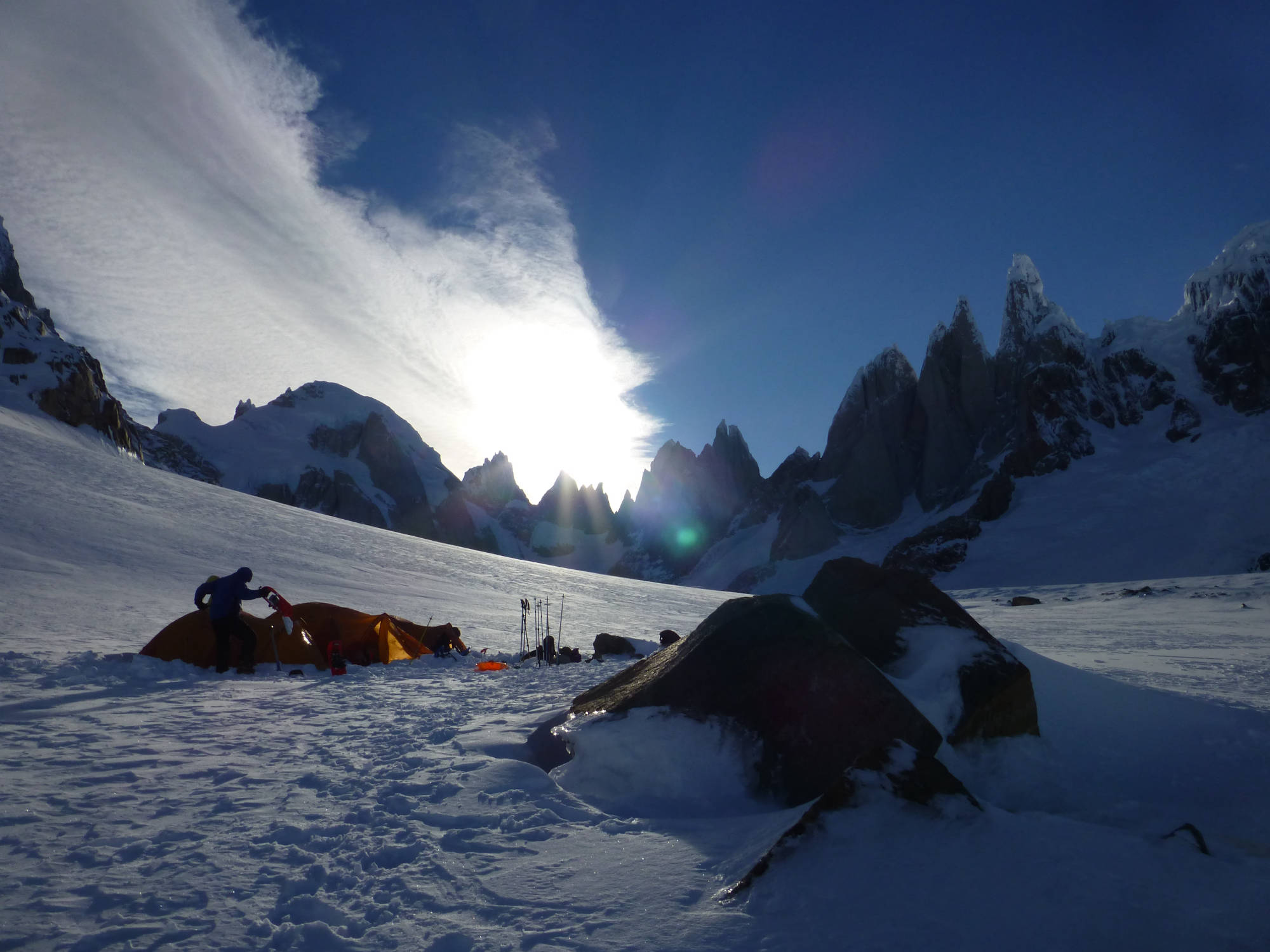 The Patagonian Ice Cap is the third largest extension of ice of the world, and the biggest in South America. It has an average height of 1500m/a/s/l, and it can be described like a vast plain covered with snow and crossed by the Andes from north to south. In this program, we will circumnavigate the Fitz Roy & Cerro Torre mountain range, covering a distance of approx. 100km. From Marconi Pass, we´ll attempt to climb Mount Gorra Blanca (2900m). This is one of the most challenging and impressive trips in Southern Patagonia.