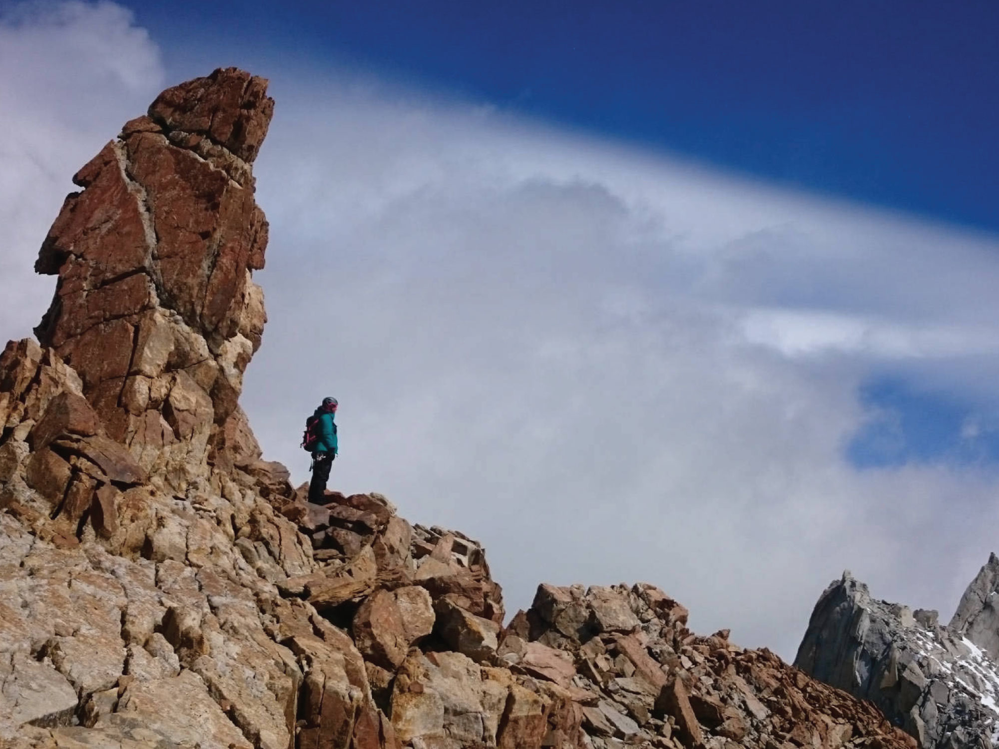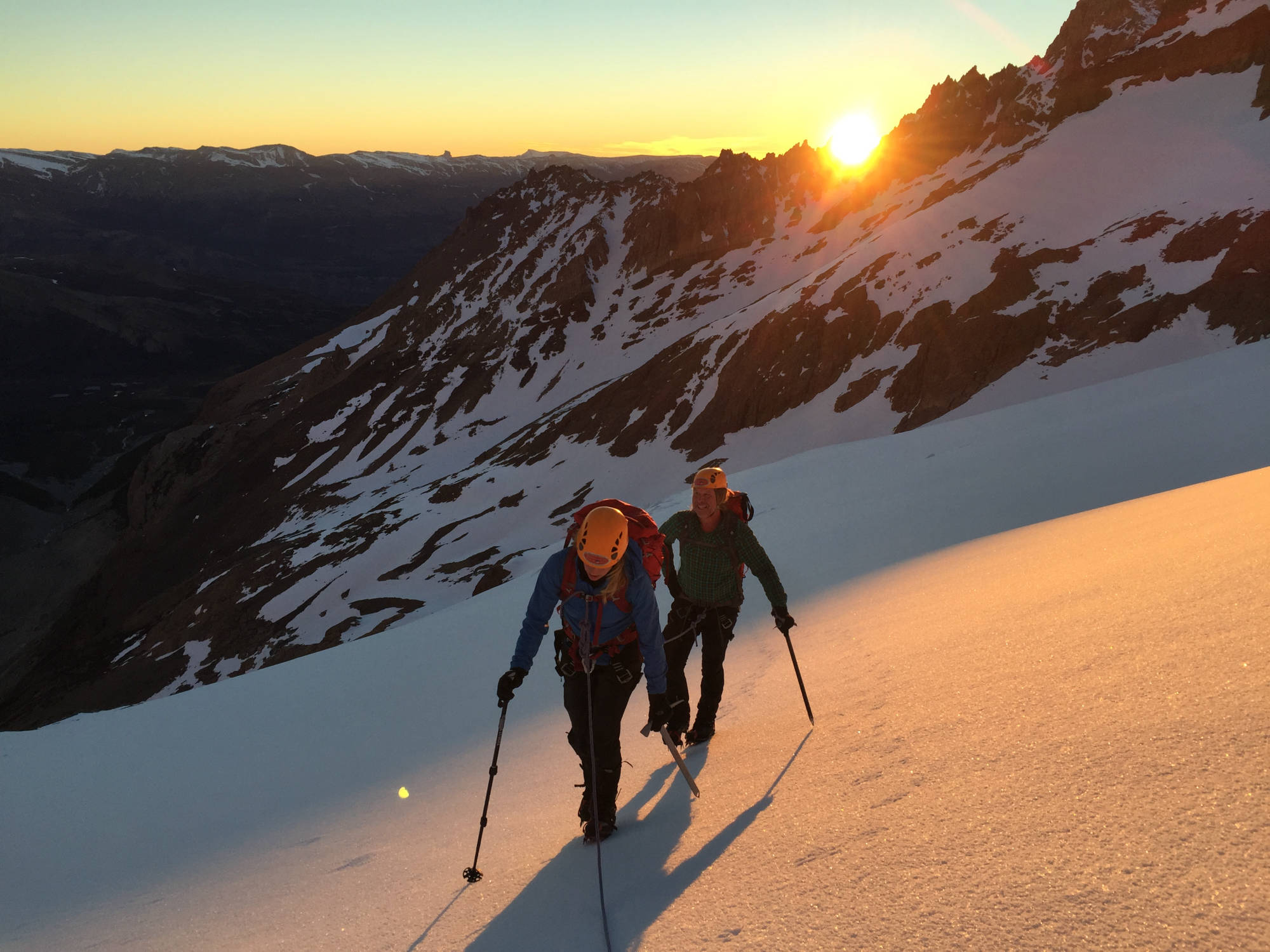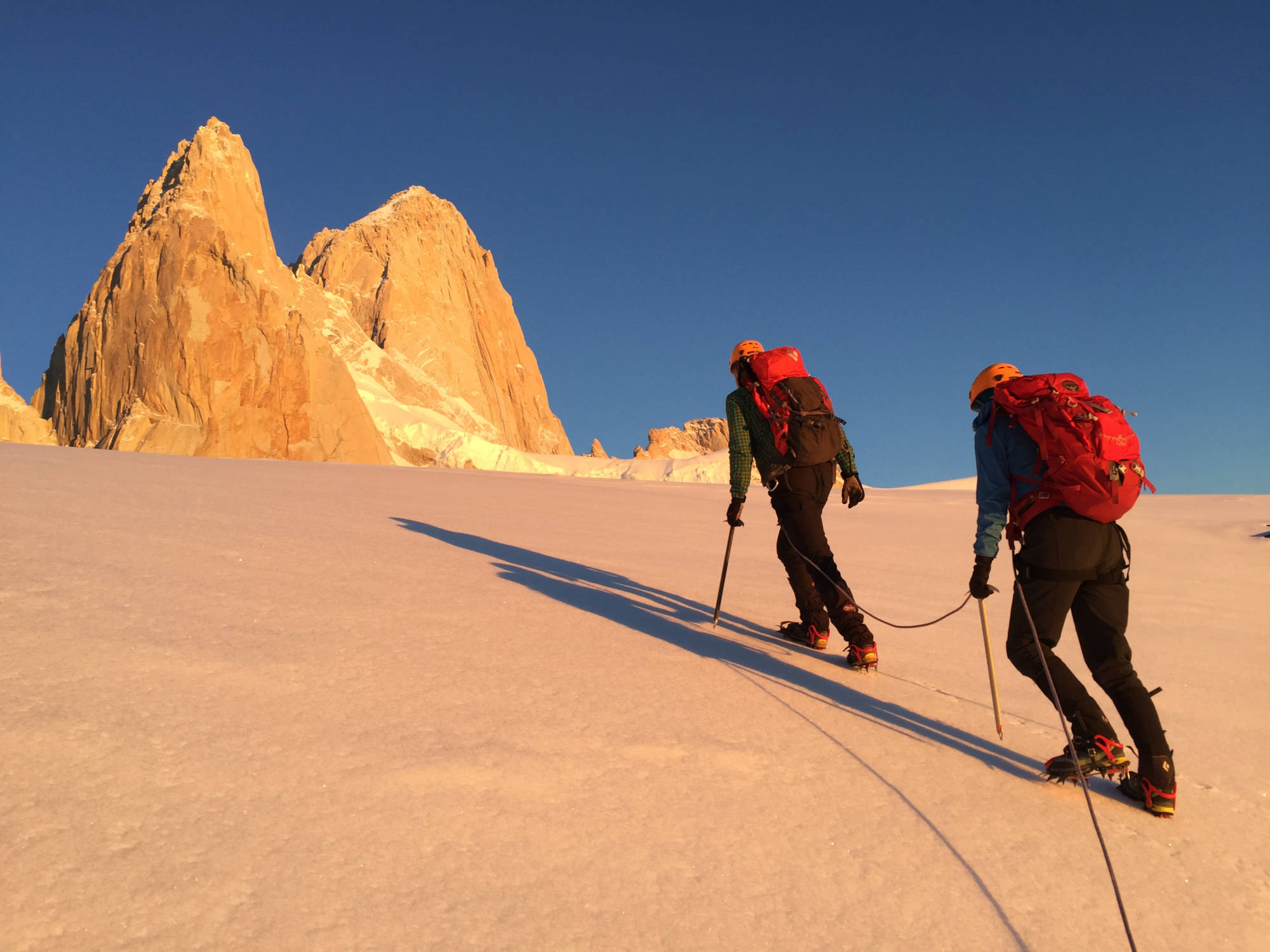 We start before sunrise from our bivouac (around 5-6 am). After 45 minutes uphill through rocky terrain, we reach the base of the glacier. From there, we proceed with crampons and rope toward the rocky ridge. Scrambling (grades II & III) and short-roping follow, with one pitch of class IV (15-20m). The views from the top are incredible! After a break at the summit (2163m), we rappel and downclimb the same way back to the rock cave. We collect our camping gear and head back to El Chaltén. The activity takes around 12hrs total, with an elevation gain of approx. 900m.