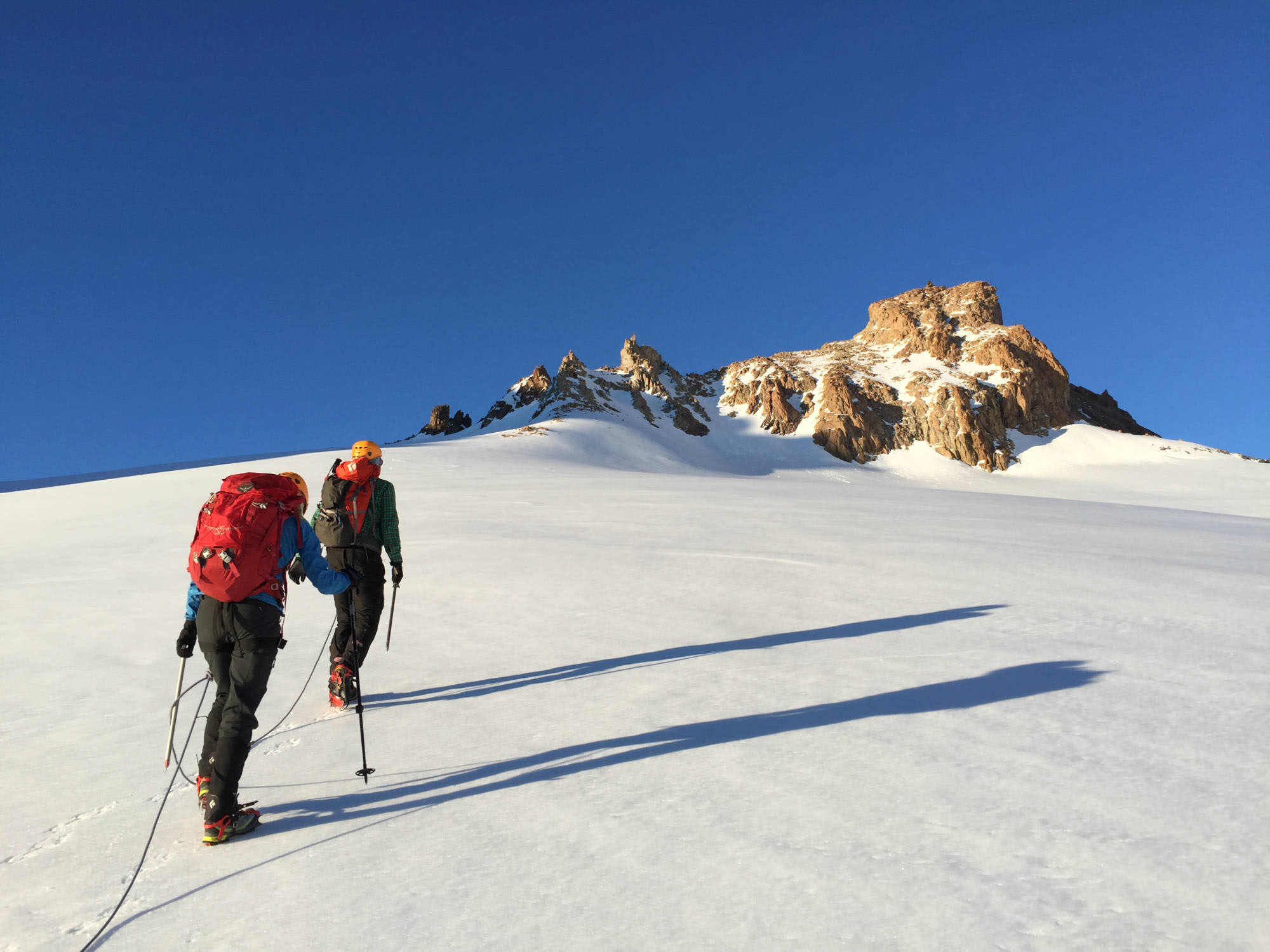 The objective of this trip is to climb “Cerro Mojon Rojo” (2163m/a/s/l), which is a classic mountaineering ascent, challenging but without technical difficulties. The terrain involves steep screes, scrambling, a 20m section of class IV, and glacier slopes between 30° to 40°. This is a very scenic peak due to the mountain’s location.