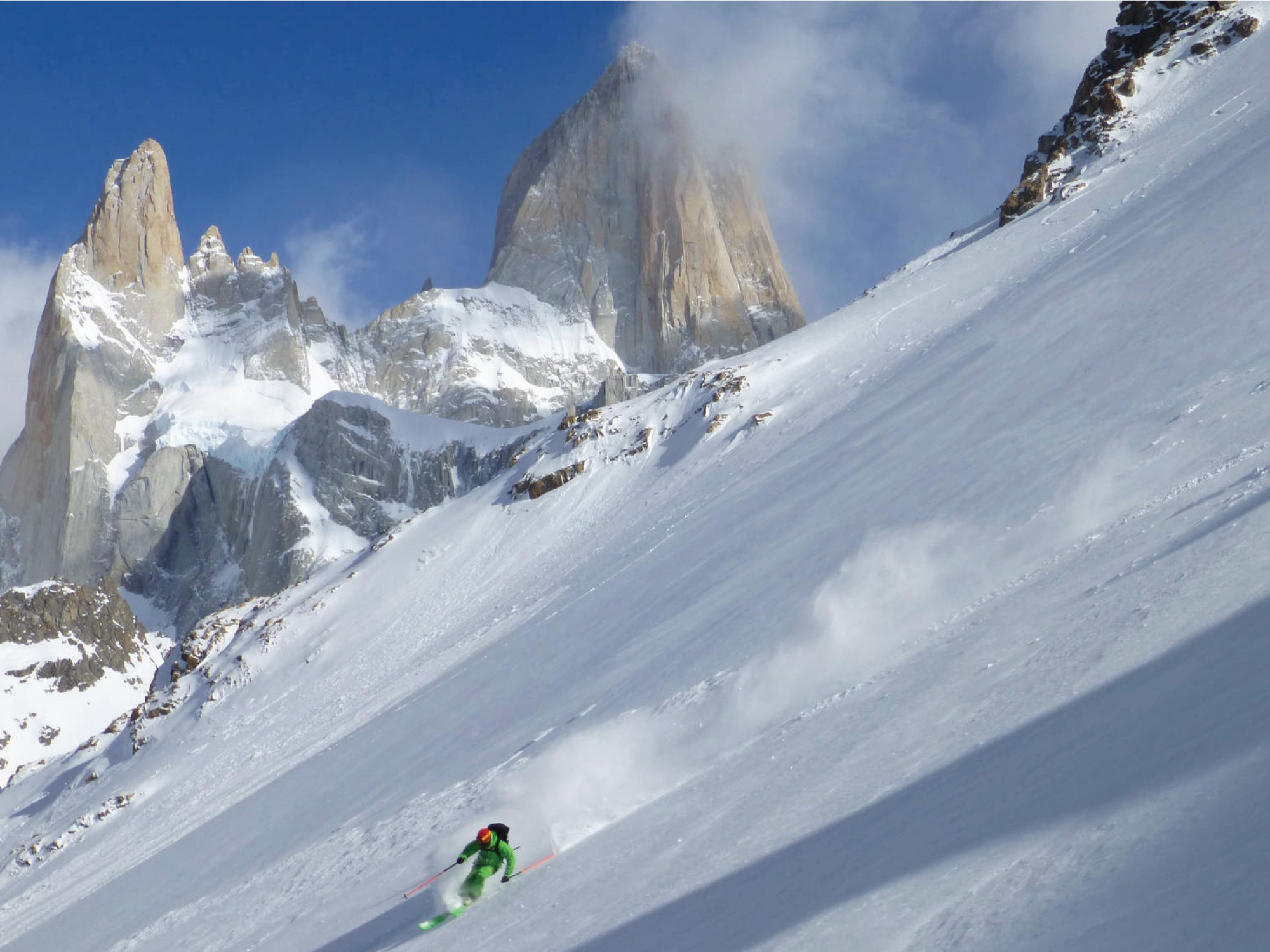Transfer to Lago del Desierto. Ski "Cerro Vespignani" (2146m). Vertical drop: 1500m. Lodging at El Chaltén.
