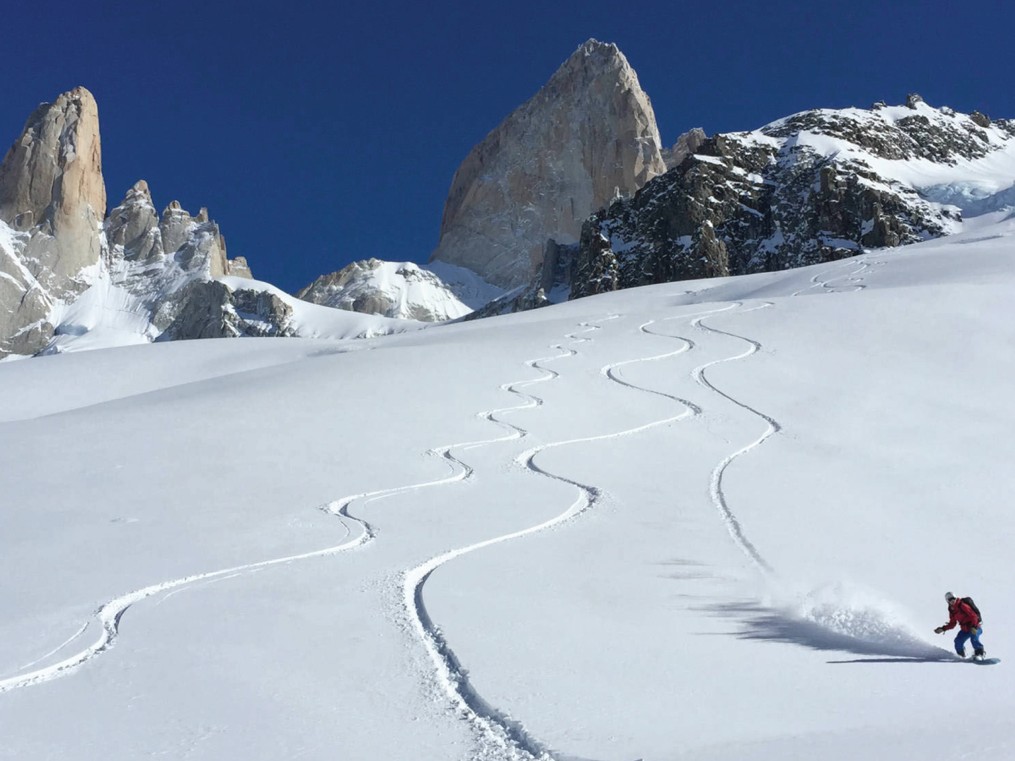 Transfer to Mosquito Creek; Ski Loma del Diablo (1800m). Vertical drop: 1200m. Lodging at El Chaltén.
