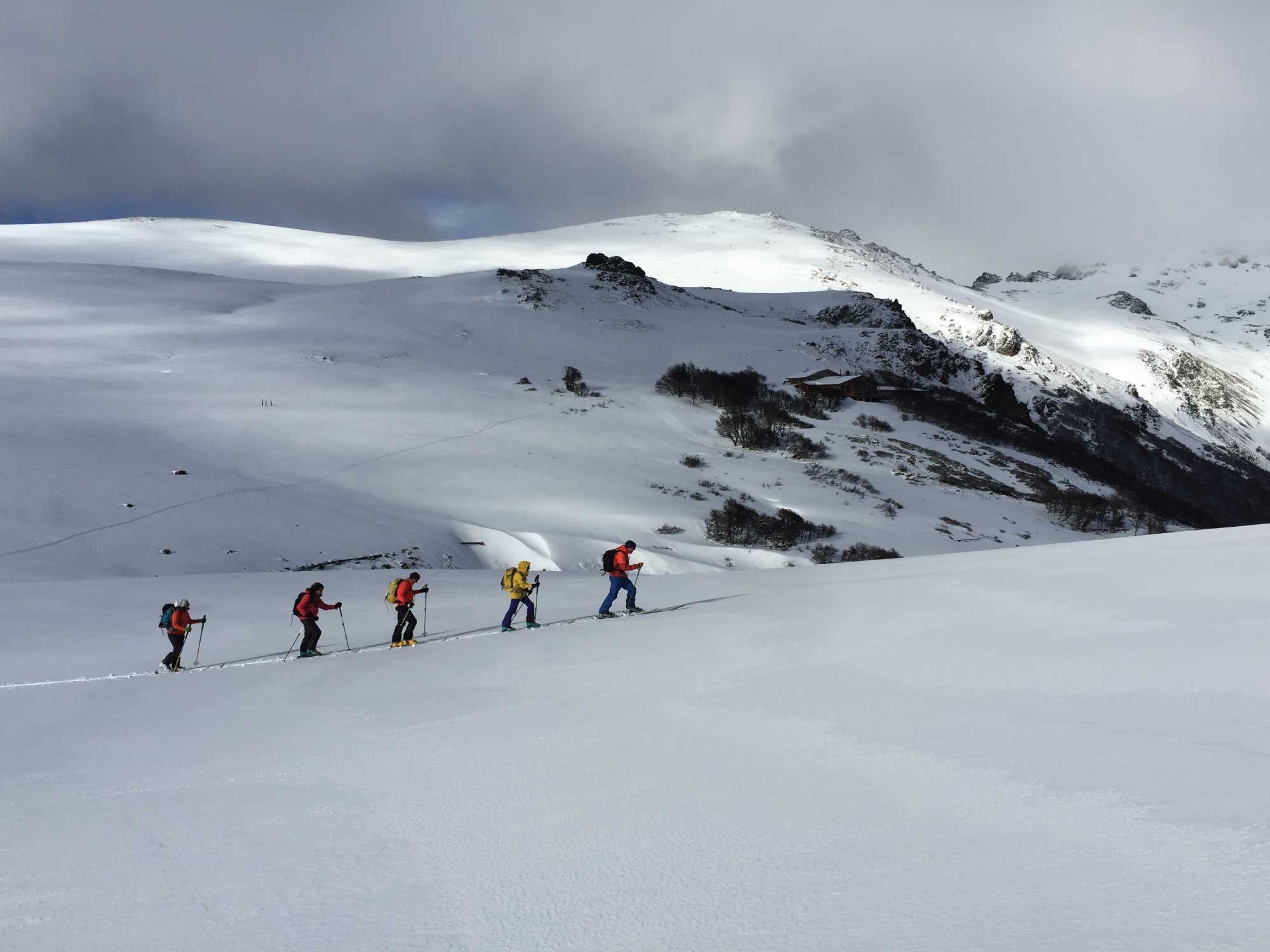 Transfer to Catedral Ski Resort. We’ll take the lifts to reach the ridge of the mountain, and start our traverse to Frey Hut. Excellent views of Nahuel Huapi Lake and the surrounding mountains! We’ll ski down the Van Titter valley, and then skin up to Refugio Frey. Lodging at Refugio Frey.