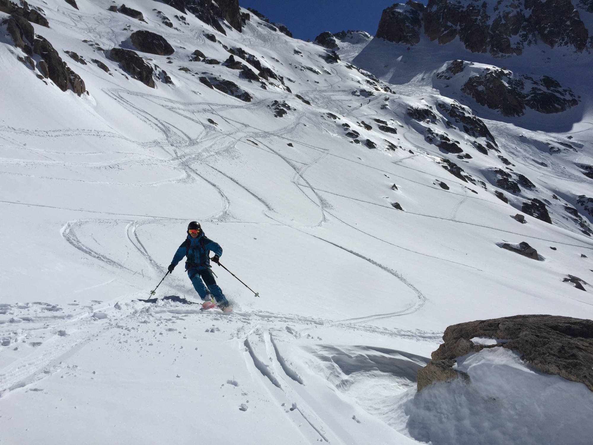 We have the entire day to go ski touring with a light pack, around the frozen “Laguna Toncek”, surrounded by granite towers. Slopes and chutes to choose according to snow and weather conditions. Lodging at Refugio Frey.