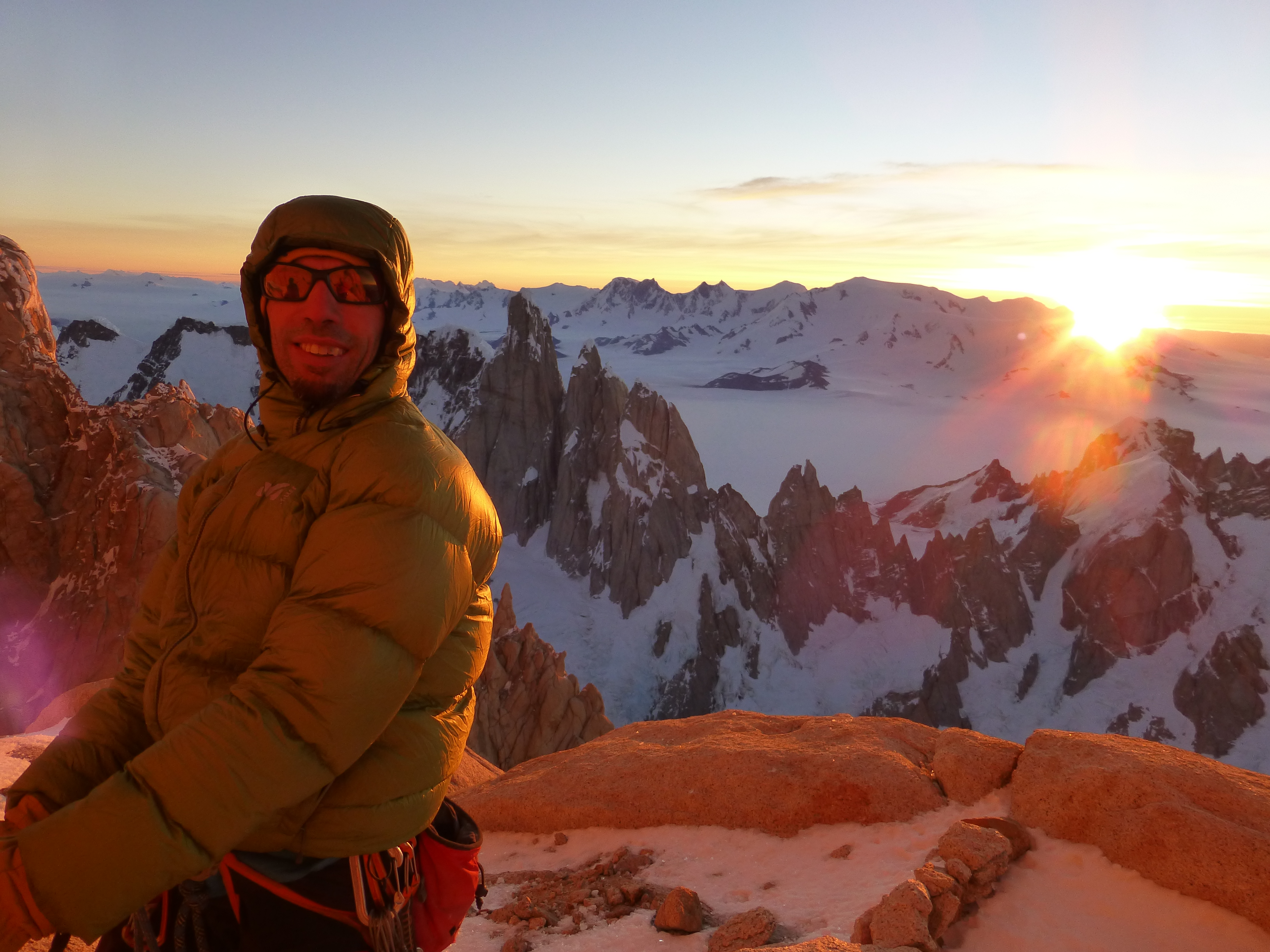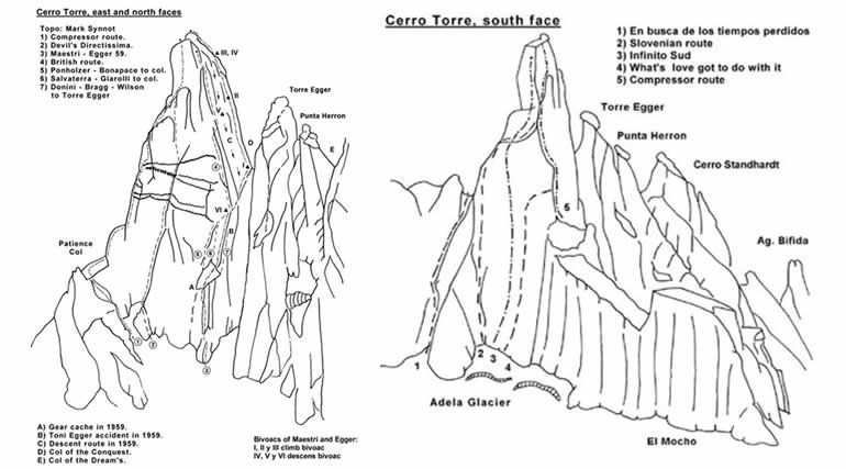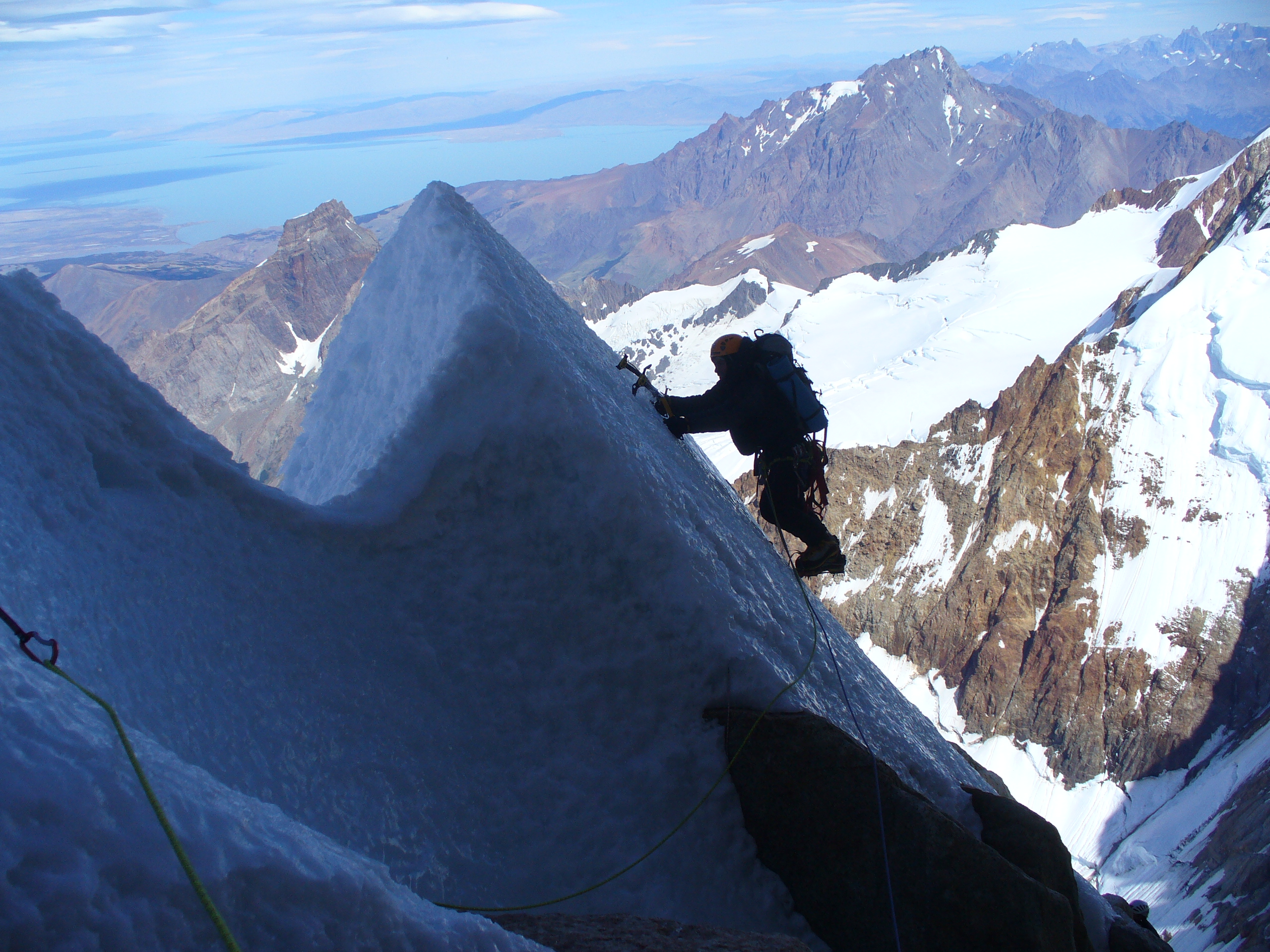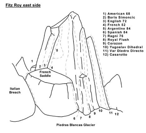 Mount Fitz Roy is the highest peak of the region, at the Eastern side of the Southern Patagonian Ice Field, and is included in “Los Glaciares National Park,” on the Argentine Patagonia, accessible in practice only by that country. It is the most striking summit of a huge group of impressive and challenging peaks and summits, that in no way envy the Torres del Paine of Chilean Patagonia, but which possesses certain characteristics of its own which make it very interesting. Possibly this mountain, along with many others of the zone, are and will continue being the dream, the maximum destiny of "the conquerors of the useless." The "Fitz" is part of a granite massif, which includes a mountain range of several smaller needles—satellites of it—further from the Patagonian Ice than its neighboring Cerro Torre, for example, allowing somewhat better weather conditions. The Fitz Roy owes its name to Robert Fitz Roy, captain of the Beagle, the famous vessel that carried Darwin on his way through South America. The Tehuelches originally called it "El Chaltén," which means "steaming mountain" in the Tehuelche language. However, Francisco Moreno, an Argentine expert, renamed it Fitz Roy. Despite the name change, it remains engraved in the hearts of countless climbers who have dreamed of it.